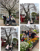 桜が満開に開いたころに公園にお花見をしにいきました。気持ちの良い風と花弁が舞い散る美しい風景に皆さま喜ばれておりました。